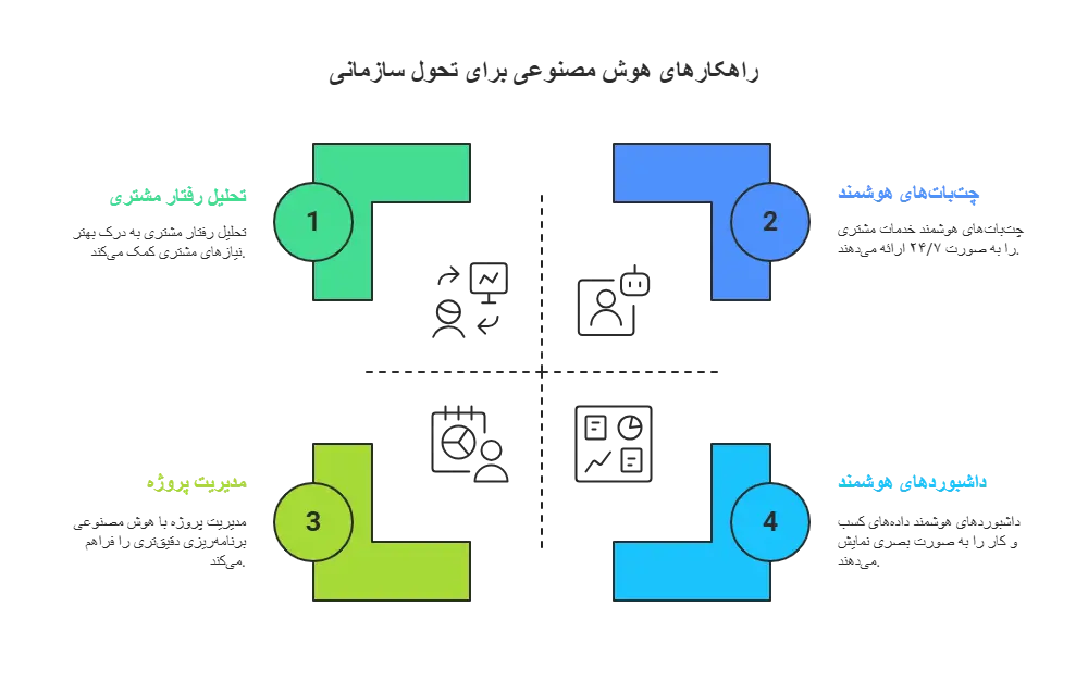 ۹. پیادهسازی اتوماسیون سازمانی با هوش مصنوعی چگونه انجام میشود؟
